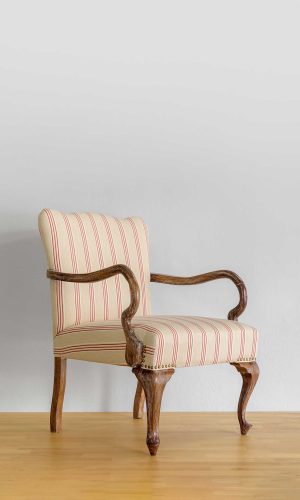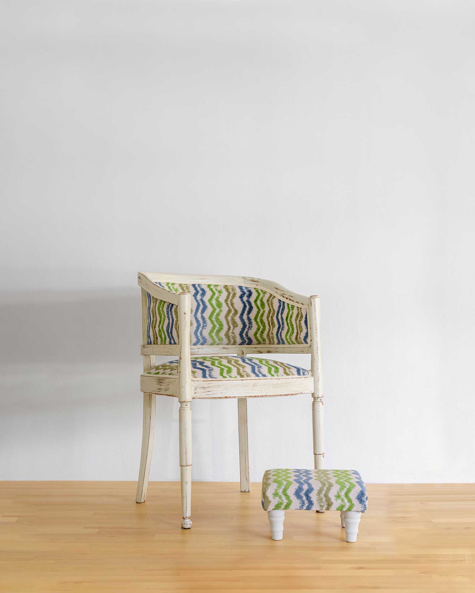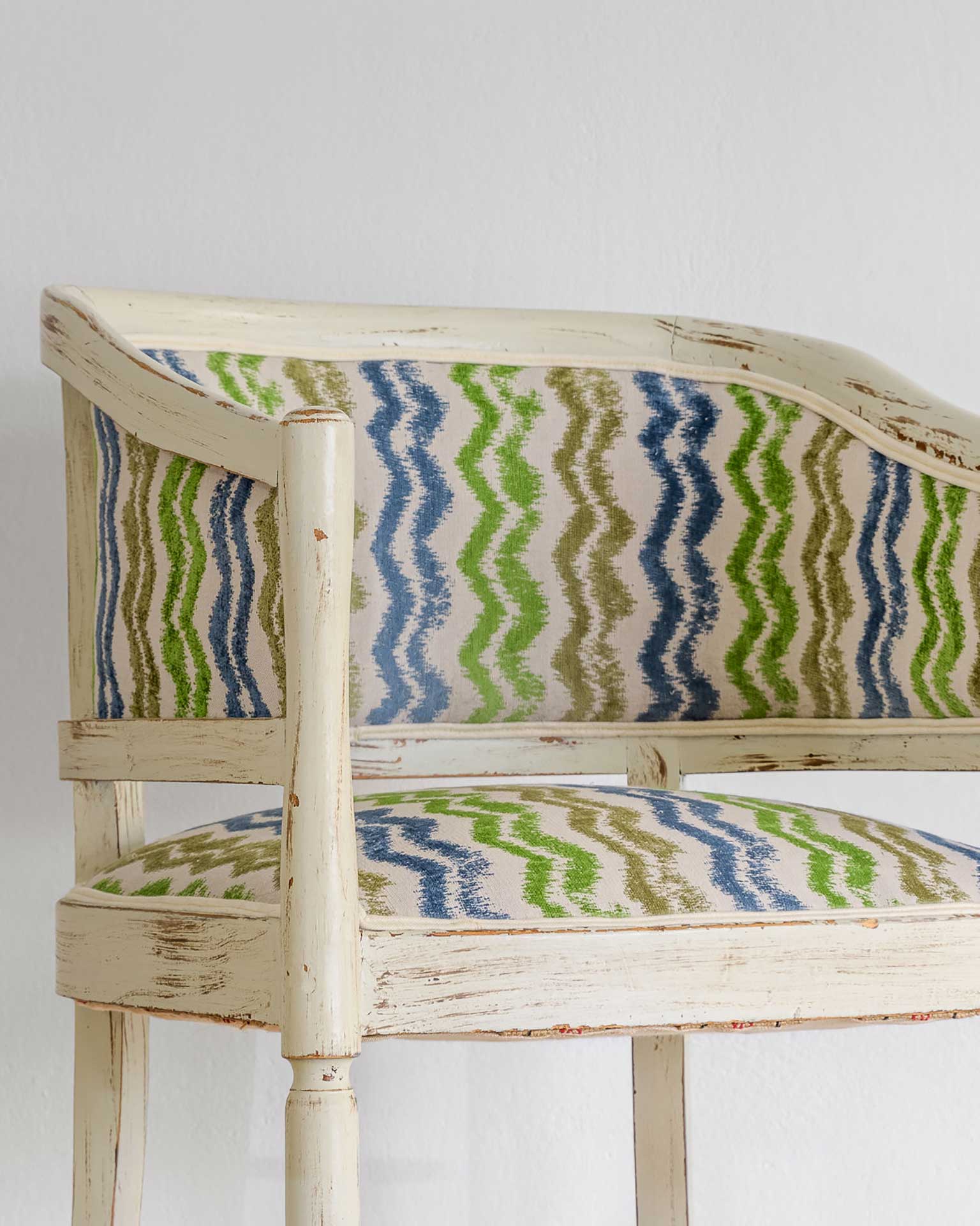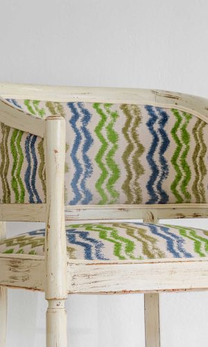 Καρέκλα πολυθρόνα με καμπυλωτή πλάτη και ξύλινο σκελετό σε γκρι πατίνα ντεκαπέ, ντυμένη με ύφασμα στα χρώματα του βυθού.